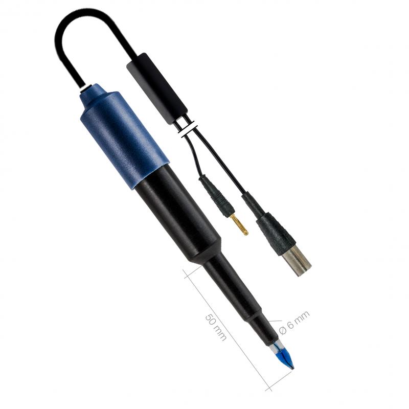 Electrodo de pH XS 2 PORE F TEMP DIN, diámetro Ø 6 mm, L= 35 mm, rango pH 0…14, temp. 0…+60 °C, cuerpo POM. Electrolito polímero. Con sensor de temperatura Pt1000 integrado, con cable fijo y conector DIN + banana 4 mm. Para penetración en alimentos Ø 6 mm.