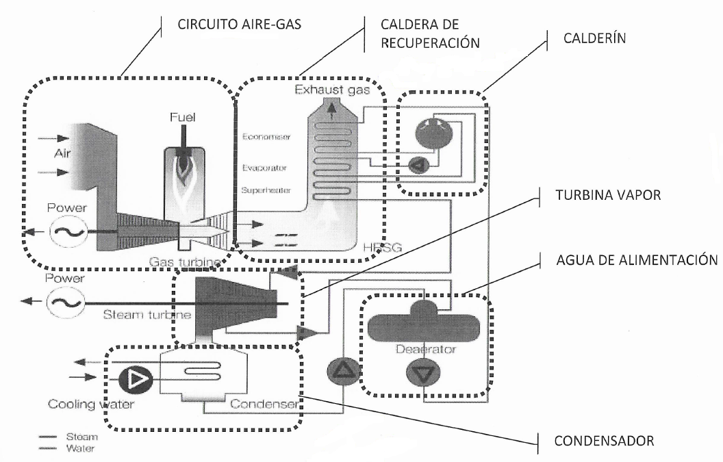 A continuación, os presentamos el circuito agua-vapor y aire-gas de una CTCC: