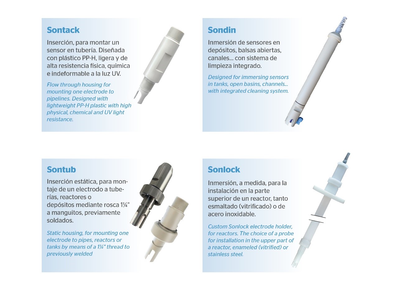 - Sontack: inserción para montar un sensor en tubería. Diseñada con plástico PP-H, ligera y de alta resistencia física, química e indeformable a la luz UV.
