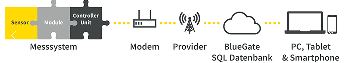 El sistema cuenta con la posibilidad de un servicio de “Cloud data” (BlueGate) para registrar todos los valores, espectros, configuración y permitir el acceso al cliente desde cualquier ubicación.