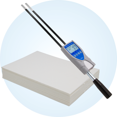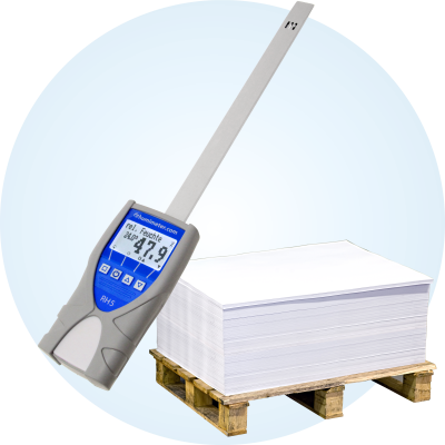 La utilización del medidor de humedad en la industria del papel corresponde al análisis en pilas de papel para determinar el contenido absoluto de agua en rollos de papel, ya sean fríos, calientes o estancados. Asimismo, se emplea para el control automático del clima de salas de impresión y almacenes de papel.