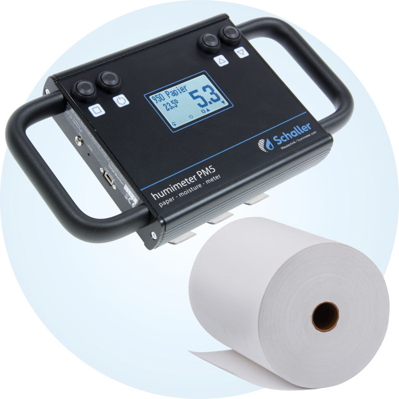 Medidor de la humedad en pilas de papel para el contenido absoluto de agua en rollos de papel (gran profundidad de medición). También para el control automático del clima de salas de impresión y almacenes de papel.
